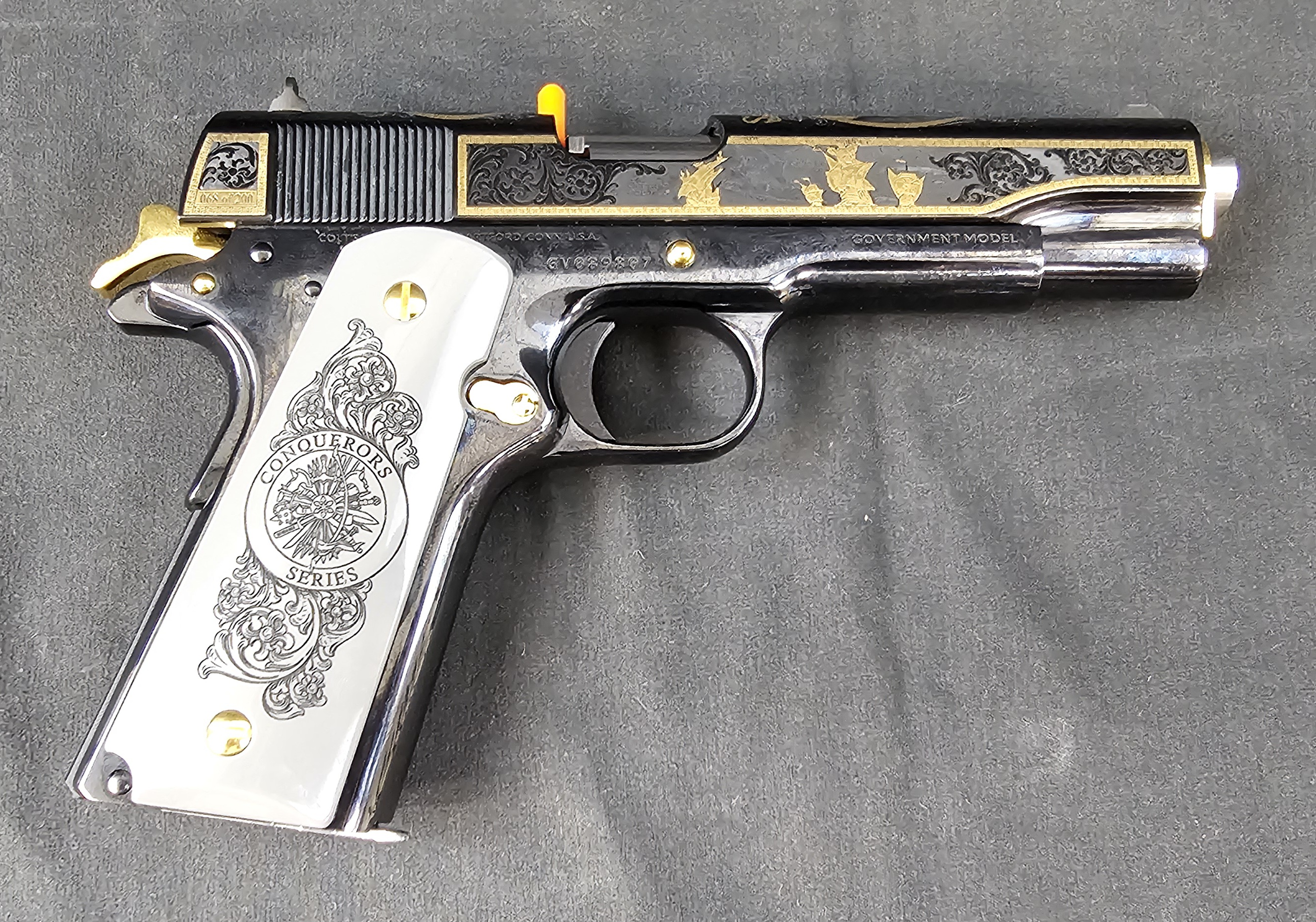 Built on the classic Government Model 1911 platform, this pistol is chambered in .38 Super, a caliber renowned for its flat trajectory, smooth recoil impulse, and competition-grade accuracy. The slide and frame feature deep, high-polish blue complemented by ornate engraving depicting Conquerors Series motifs, making this firearm equally suited for display, investment, or refined shooting use.