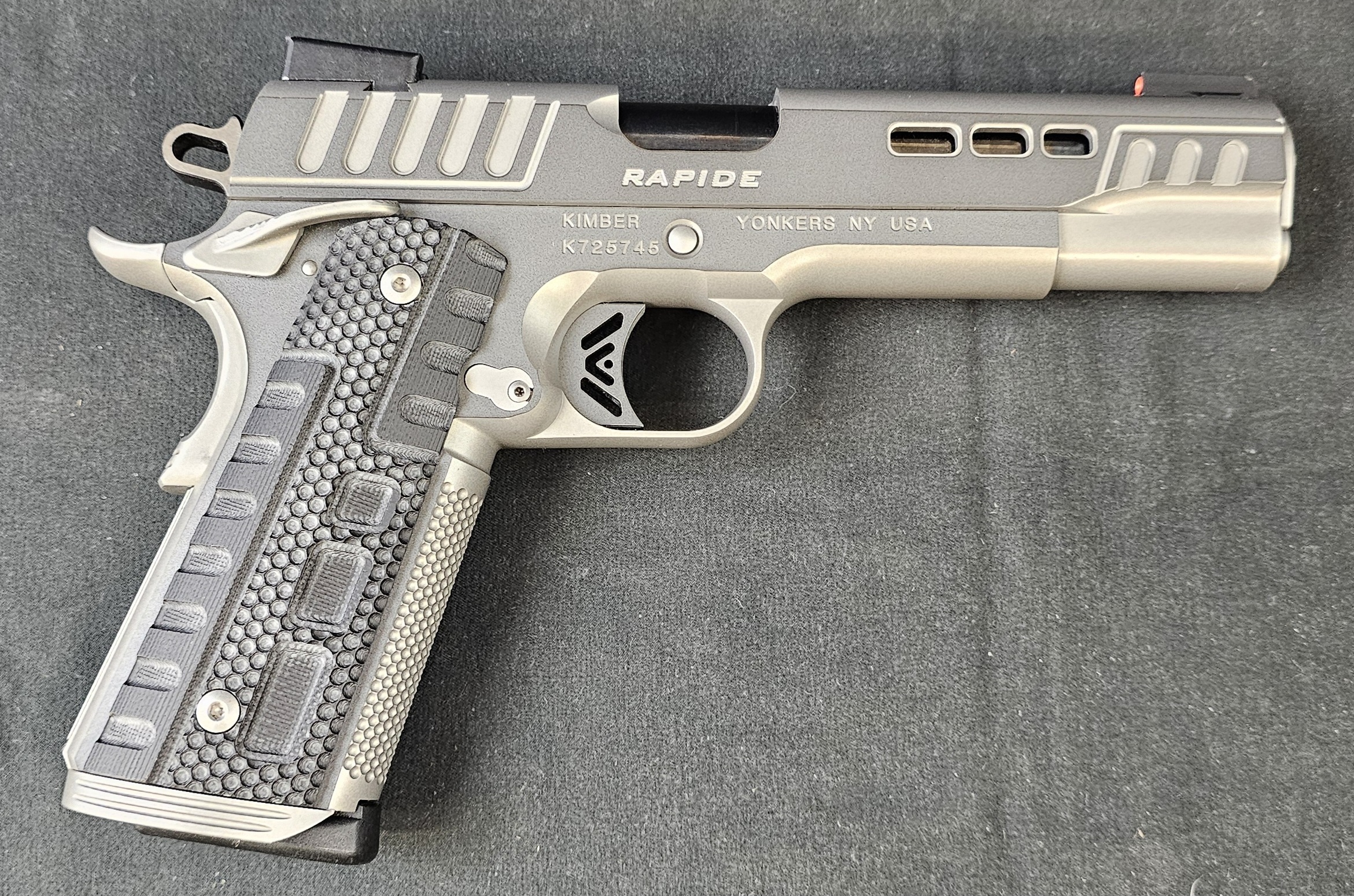 The Kimber Rapide .45 ACP is a high-performance 1911 designed for shooters who demand speed, accuracy, and style. Built with Kimber’s renowned craftsmanship, the Rapide features a 5-inch stainless steel match-grade barrel, a lightened slide with aggressive cuts for faster cycling, and a V-Cut match trigger that delivers a crisp, clean break. Its striking finish and textured G10 grips combine form and function, making this 1911 a standout at the range or in competition.